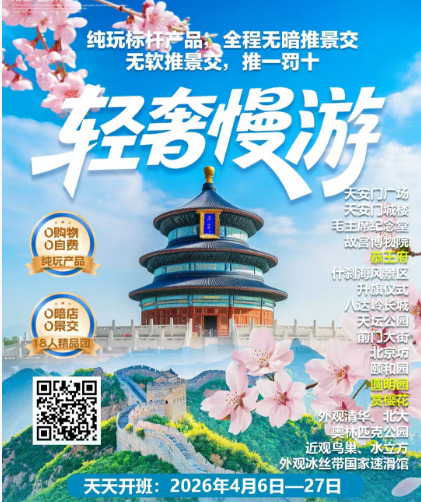 “轻奢慢游”是专为中高端客人定制的一款精品纯玩团!定制行程,高标配置,全程无购物无自费,纯净体验!景区游览时间加长、资深导游深度讲解、线路轻松闲情逸致、早睡晚起放慢脚步,静静感受北京慢生活!