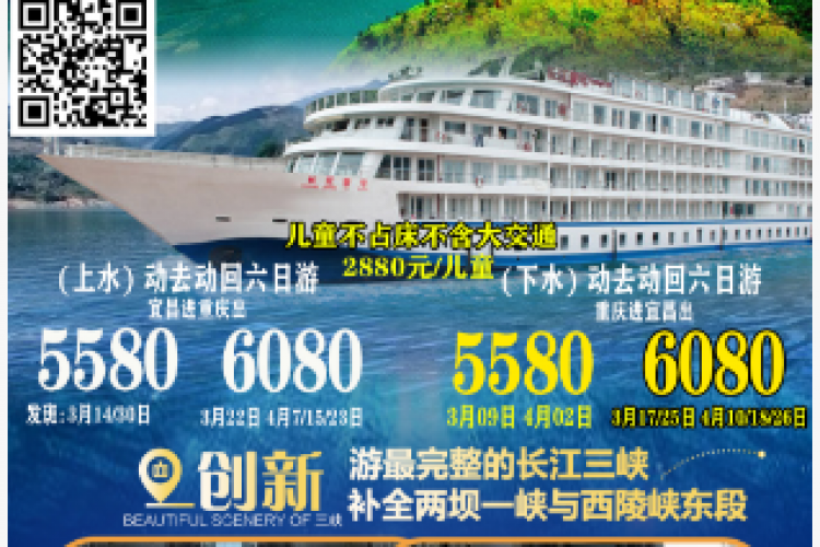 行程特色: 1、乘坐豪华游轮是最奢侈、最享受的旅行方式之一,游客在船上可以尽情吃喝玩乐,享受水天一色簇拥的悠闲时光,船上还会举办花样百出的各种活动,让旅途再也不是枯燥无聊。游轮停靠的地点也都是风景名胜,安排游客上岸游览,游客既不需带着行李一路奔波,也不用为三天两头换旅馆而困扰; 2、我们采用的游船是三峡豪华游船品质的标杆,整个游船就好像是航行在江上的一座度假饭店,包括餐厅、咖啡厅、酒吧、迪斯科、图书馆、购物商店等设施一应俱全。只要你愿意,每分每秒都过得多姿多彩! 最重要的是,乘坐游轮,千万不要一直缩在房间里,那样你可会错过游轮旅行最具特色的部分; 3、赠送特色重庆市内一日游 |