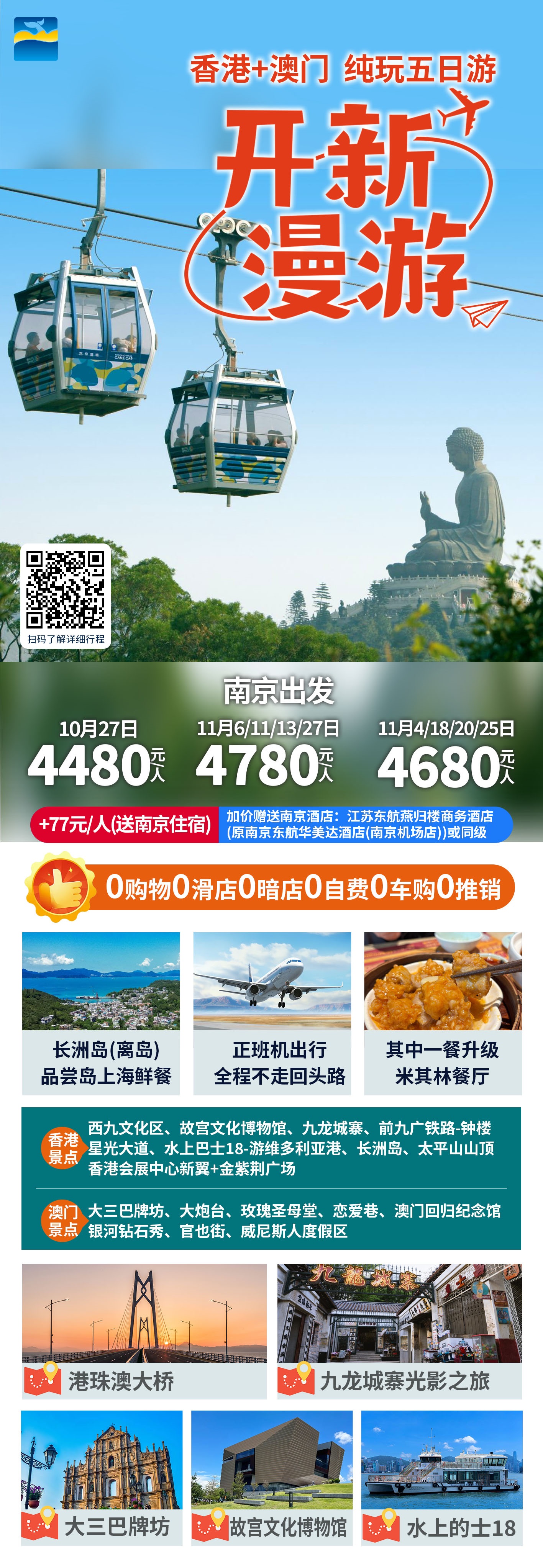 第五天 | 澳门-南京 参考航班:澳门-南京 MU9798 12:50-15:25 早晨自由活动。根据航班时间送往机场,结束精彩愉快的港澳之旅! | / | / |