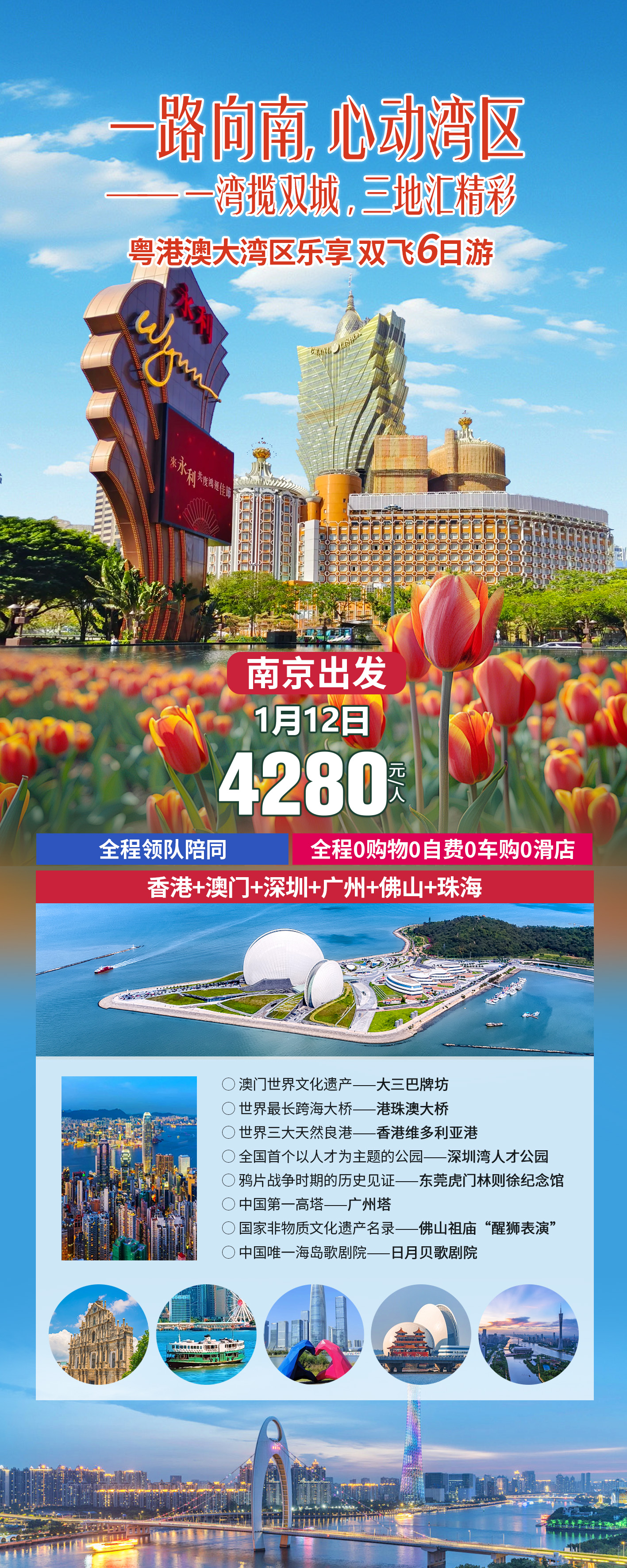 一路向南,心动湾区--粤港澳6天(澳门进珠海出MU)一次性游览澳门、香港、深圳、东莞、广州、佛山、中山、珠海经典景点